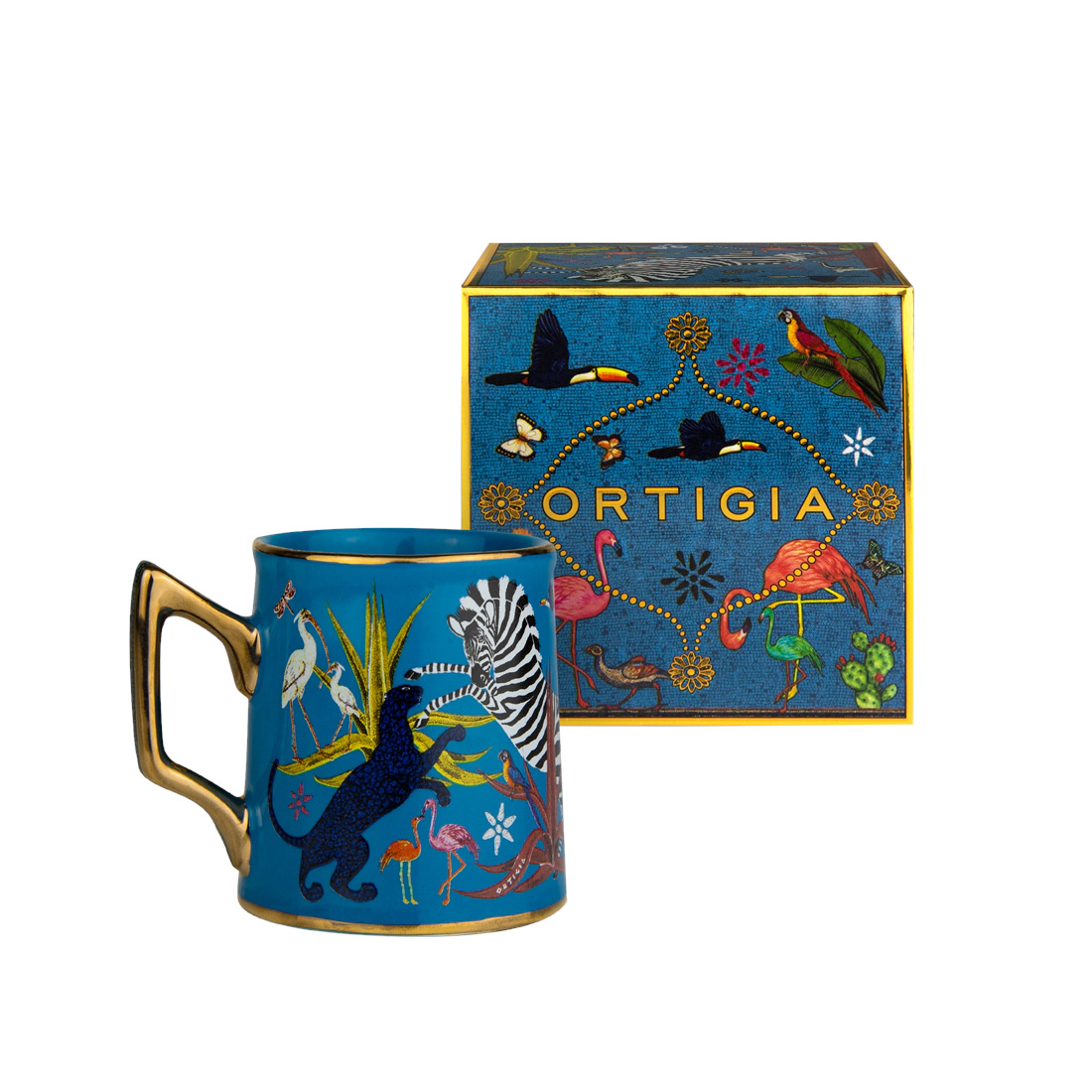 Ceramiczny kubeczek Ortigia Blue z charakterystycznymi motywami marki, uzupełniony o ręcznie wykonane zdobienia w kolorze złotym. Doskonale sprawdzi się jako uzupełnienie stołowej zastawy, w roli ulubionego kubeczka do małej kawy lub espresso.