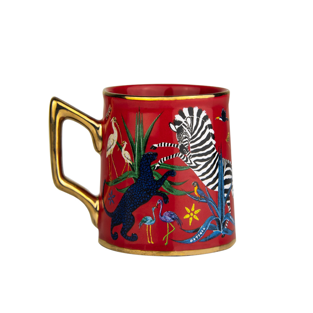 Ceramiczny kubeczek Ortigia Corallo z charakterystycznymi motywami marki, uzupełniony o ręcznie wykonane zdobienia w kolorze złotym. Doskonale sprawdzi się jako uzupełnienie stołowej zastawy, w roli ulubionego kubeczka do małej kawy lub espresso.