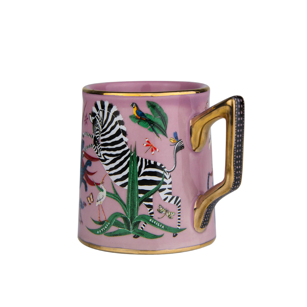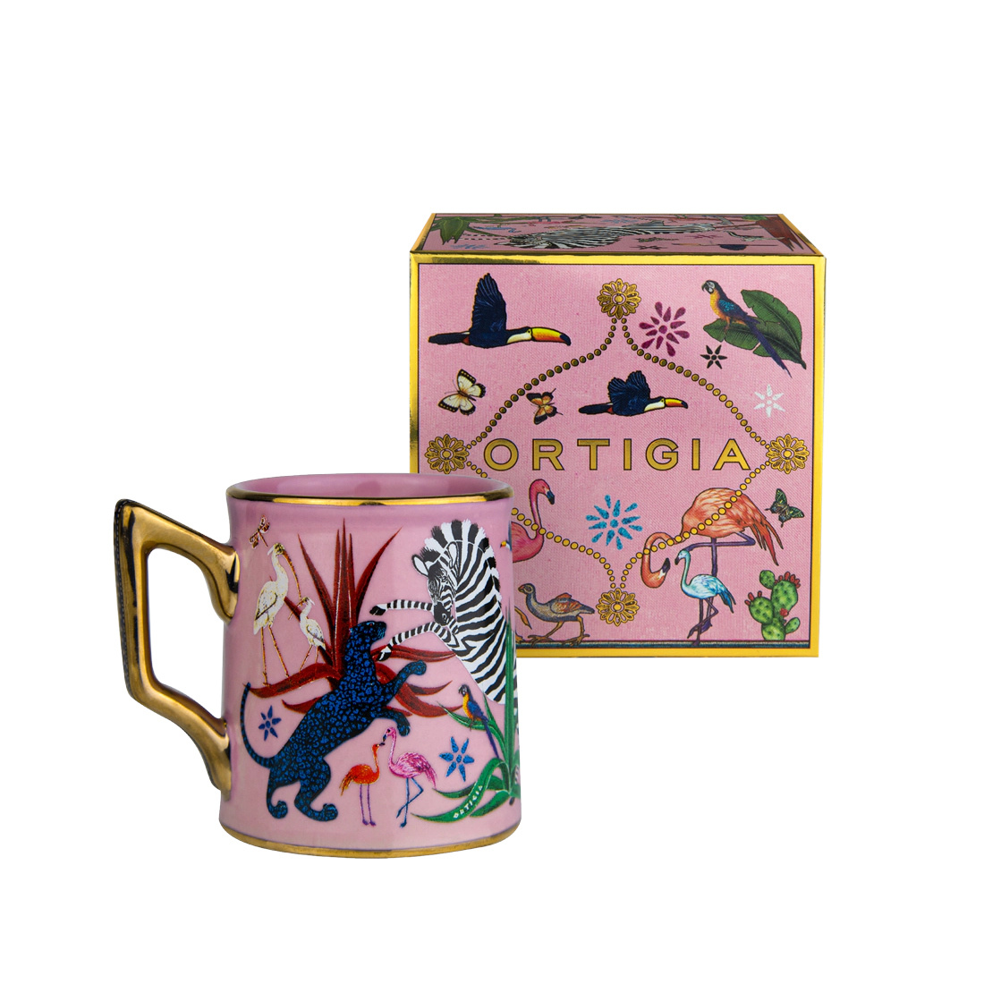 Ceramiczny kubeczek Ortigia Pink z charakterystycznymi motywami marki, uzupełniony o ręcznie wykonane zdobienia w kolorze złotym. Doskonale sprawdzi się jako uzupełnienie stołowej zastawy, w roli ulubionego kubeczka do małej kawy lub espresso.